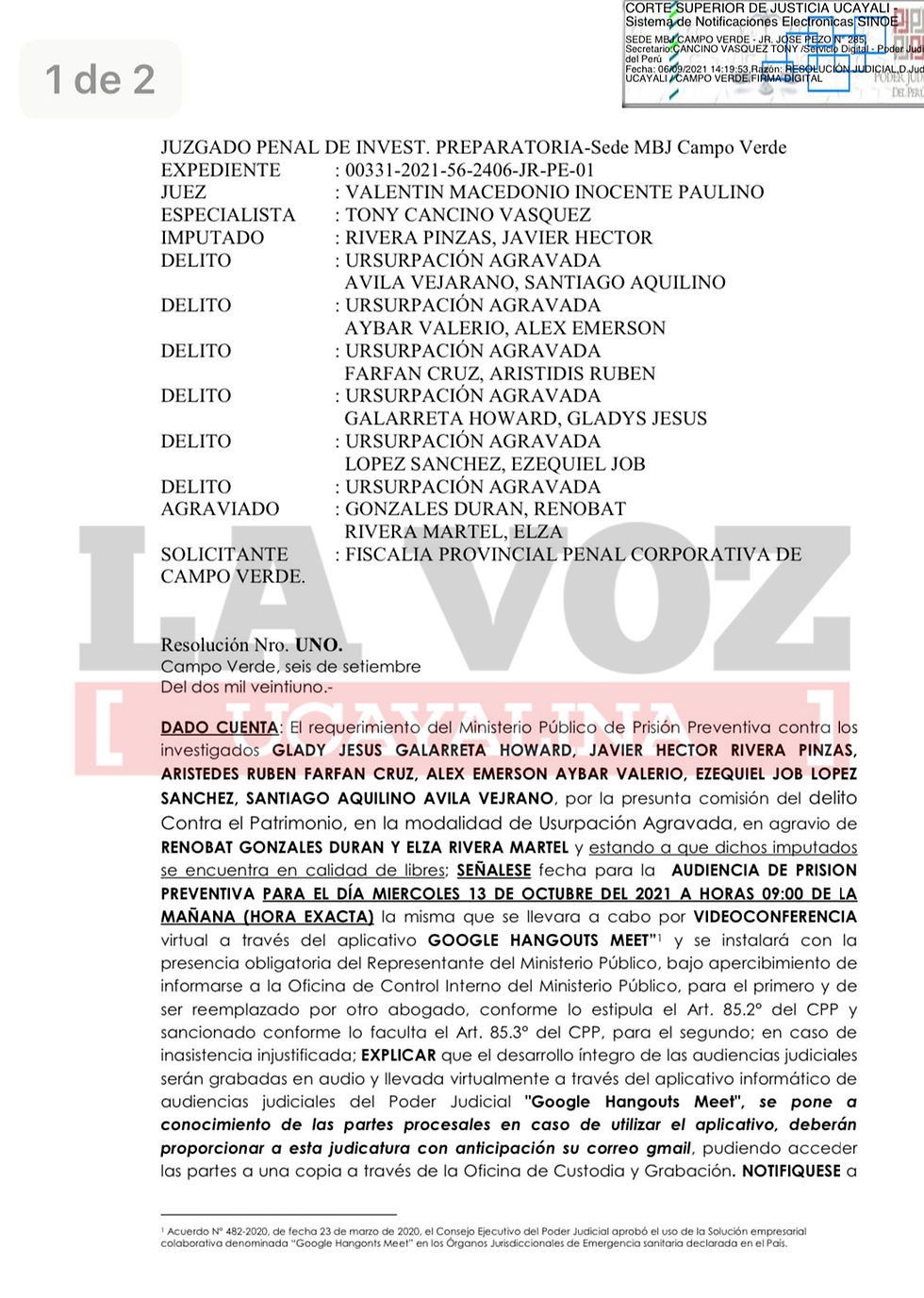 Audiencia de prisión se verá el miércoles 13 de octubre. | LVU