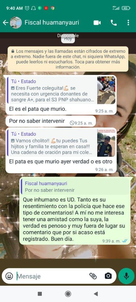 En la captura de pantalla, que fue compartida esta mañana a La Voz Ucayalina (LVU), se puede leer que Huamanyauri Cornelio preguntaba si “él es el pata que murió” a las historias que la suboficial Dávila compartió solicitando unidades de sangre y una cadena de oración para Shahuano Ruíz. Pero fue el segundo mensaje que provocó la desaprobación de la agente al punto de “no interesarle tener una amistad como la suya”, enfatizó.